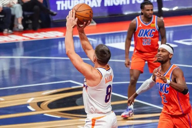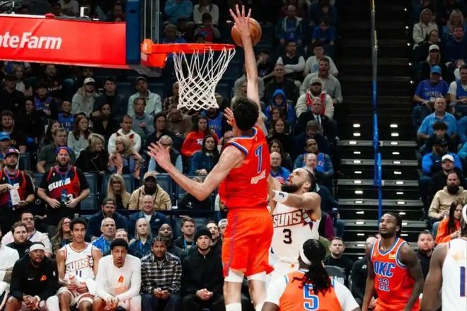 今天的比赛,完全是吊打,太阳毫无还手之力。太阳队布克和杰伦格林都打不了,而雷霆队非常健康,除了哈尔滕施泰因不打,卡鲁索、杰伦威廉姆斯都能打。比赛一开场,雷霆就展示了顶级攻防水平,单节38-23赢了太阳16分,第二节比赛,雷霆单节再次砍下36分,太阳只拿下25分,单节再赢11分。可以说,太阳全队没有任何人能对得上雷霆三巨头,亚历山大、杰伦威廉姆斯、霍姆格伦,一个比一个猛,根本防不住。