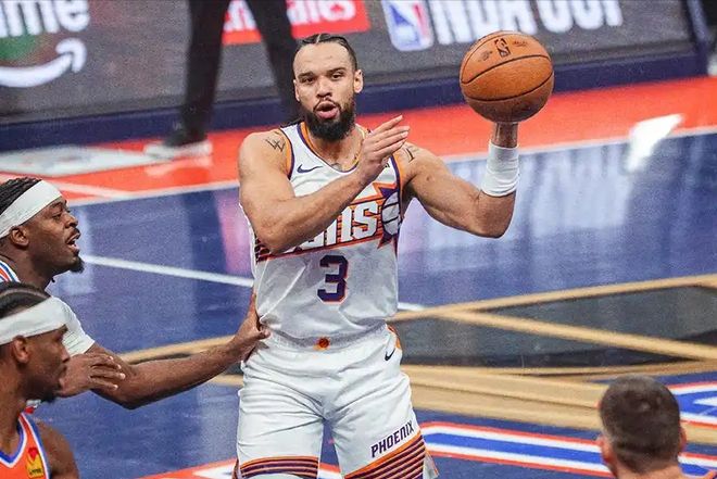 防不住的同时,太阳自己进攻也毫无章法,只能让狄龙零敲碎打,虽然他本赛季场均拿下22分,但是在面对雷霆队顶级外线防守人华莱士和维金斯时,狄龙腹背受敌,打得非常挣扎。全场比赛,狄龙16投4中,拿下16分,效率惨不忍睹。而他这个16分,还是太阳全队最高得分了,其他四个首发球员,没有一个人得分上双,当3D球员狄龙成为主攻点时,你就知道这支球队的进攻有多糟糕了。太阳今天唯一的遮羞布,是昔日湖人队的边缘人物古德温,他替补出场12投6中,拿下了全队第二高的15分,是全场唯一想拼到最后一刻的太阳球员。