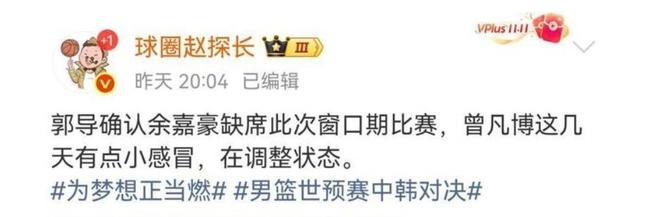 昨天中国男篮举行赛前发布会,郭士强指导在接受采访的时候说:“余嘉豪因为刚打完又飞回西班牙比赛,最近一场比赛是23号,太疲劳了,为了保护他,从身体状况考虑就没让他回来”。同时郭士强指导也提到曾凡博的情况,他说曾凡博前段时间有感冒,身体还在慢慢恢复,但是精神很好,训练质量和投入都非常好。这次周琦重回国家队,加上胡金秋、焦泊乔、李祥波、蒋浩然等,内线球员完全够用,不让余嘉豪回来,让他利用这段时间好好的训练提升自己是最好的选择。