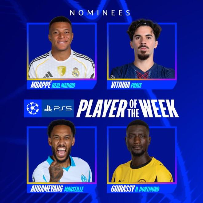 欧冠联赛阶段第5轮比赛全部战罢,欧冠官方公布了本轮最佳球员候选名单,姆巴佩领衔,维蒂尼亚、吉拉西、奥巴梅扬在列。