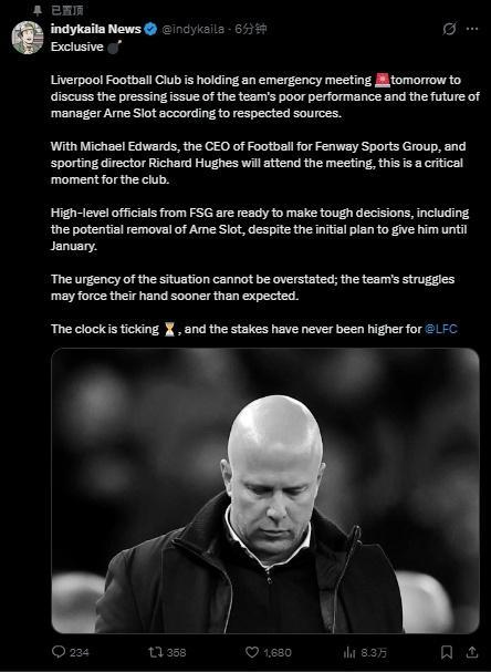 原本,利物浦高层还希望继续给斯洛特时间,让他在1月前做出改变。但在遭遇崩盘式的3连败后,利物浦的换帅似乎刻不容缓。该博主直言:“对于利物浦来说,这是有史以来最危急的关头之一。”
